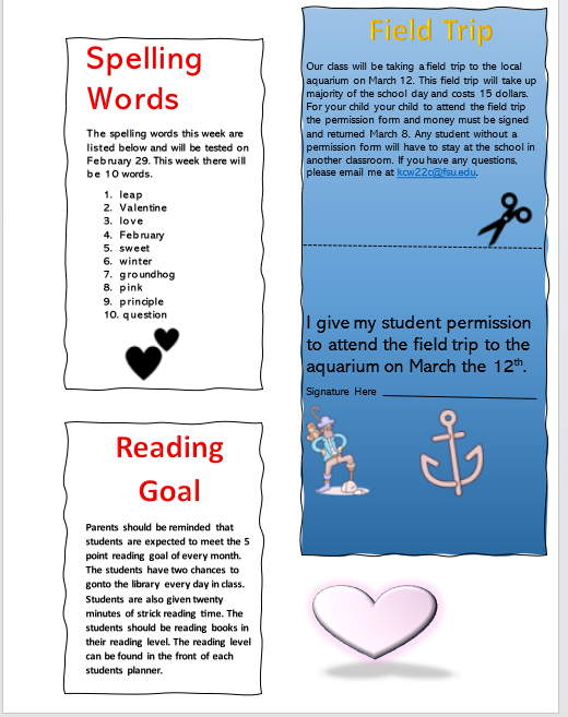 The newspaper web designed helped me develop many new skills in word and Canva. I had little to no experience working with the program Canva. I learned how to make a backdrop and create my own images in Canva. I learned how to make a hyperlink in word and how to work with shapes in Word. In my future career, I plan on making newsletters for my future students and will use the skills I learned in Canva to help me create a backdrop for my own classroom.